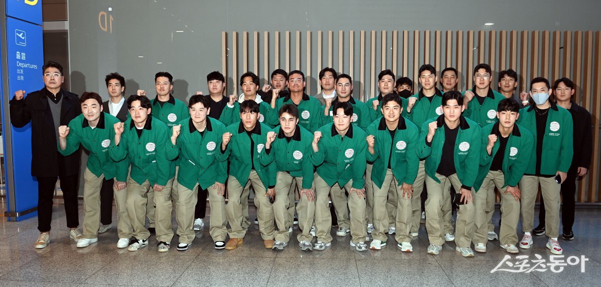 키움 히어로즈가 23일 인천국제공항을 통해 2025시즌 스프링캠프가 열리는 미국으로 출국한다. 출국에 앞서 키움 홍원기 감독 및 코치, 선수들이 그린 단복을 입고 카메라를 향해 포즈를 취하고 있다. 인천국제공항 | 김민성 기자 marineboy@donga.com