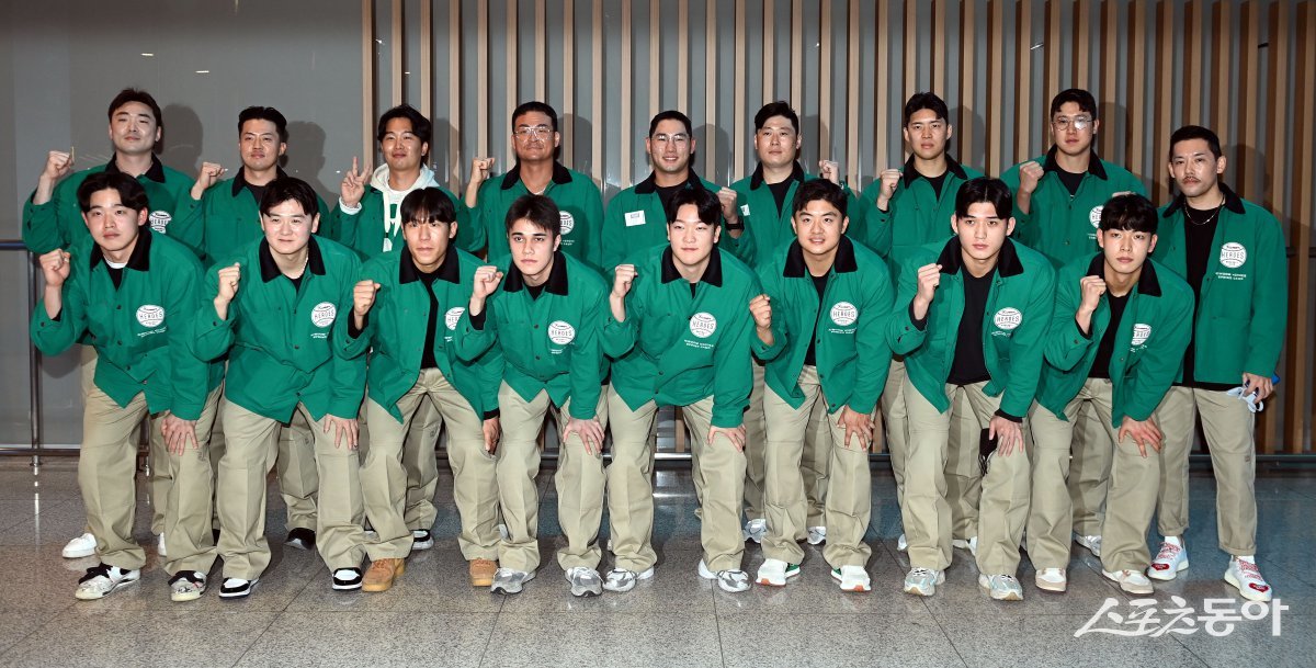 키움 히어로즈가 23일 인천국제공항을 통해 2025시즌 스프링캠프가 열리는 미국으로 출국한다. 출국에 앞서 키움 선수들이 그린 단복을 입고 카메라를 향해 포즈를 취하고 있다. 인천국제공항 | 김민성 기자 marineboy@donga.com
