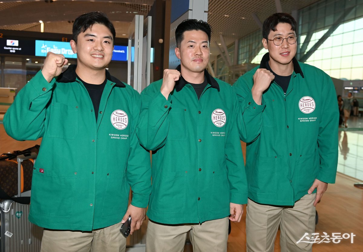 키움 히어로즈가 23일 인천국제공항을 통해 2025시즌 스프링캠프가 열리는 미국으로 출국한다. 출국에 앞서 키움에 합류한 강진성, 오선진, 김동엽이 카메라를 향해 포즈를 취하고 있다. 인천국제공항 | 김민성 기자 marineboy@donga.com