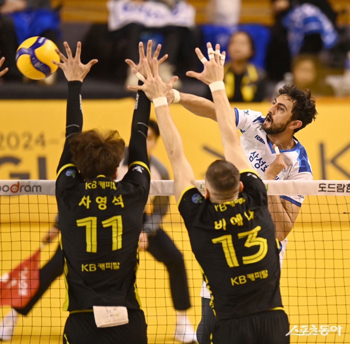 23일 의정부 경민대체육관에서 열린 ‘도드람 2024~2025 V-리그’ 남자부 KB손해보험과 삼성화재 경기에서 삼성화재 파즐리가 KB손해보험의 블로킹 사이로 스파이크를 날리고 있다. 의정부 | 김종원 기자 won@donga.com