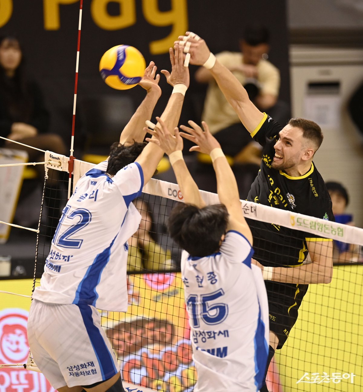 23일 의정부 경민대체육관에서 열린 ‘도드람 2024~2025 V-리그’ 남자부 KB손해보험과 삼성화재 경기에서 KB손해보험 비예나가 삼성화재 블로킹 사이로 스파이크를 날리고 있다. 의정부 | 김종원 기자 won@donga.com