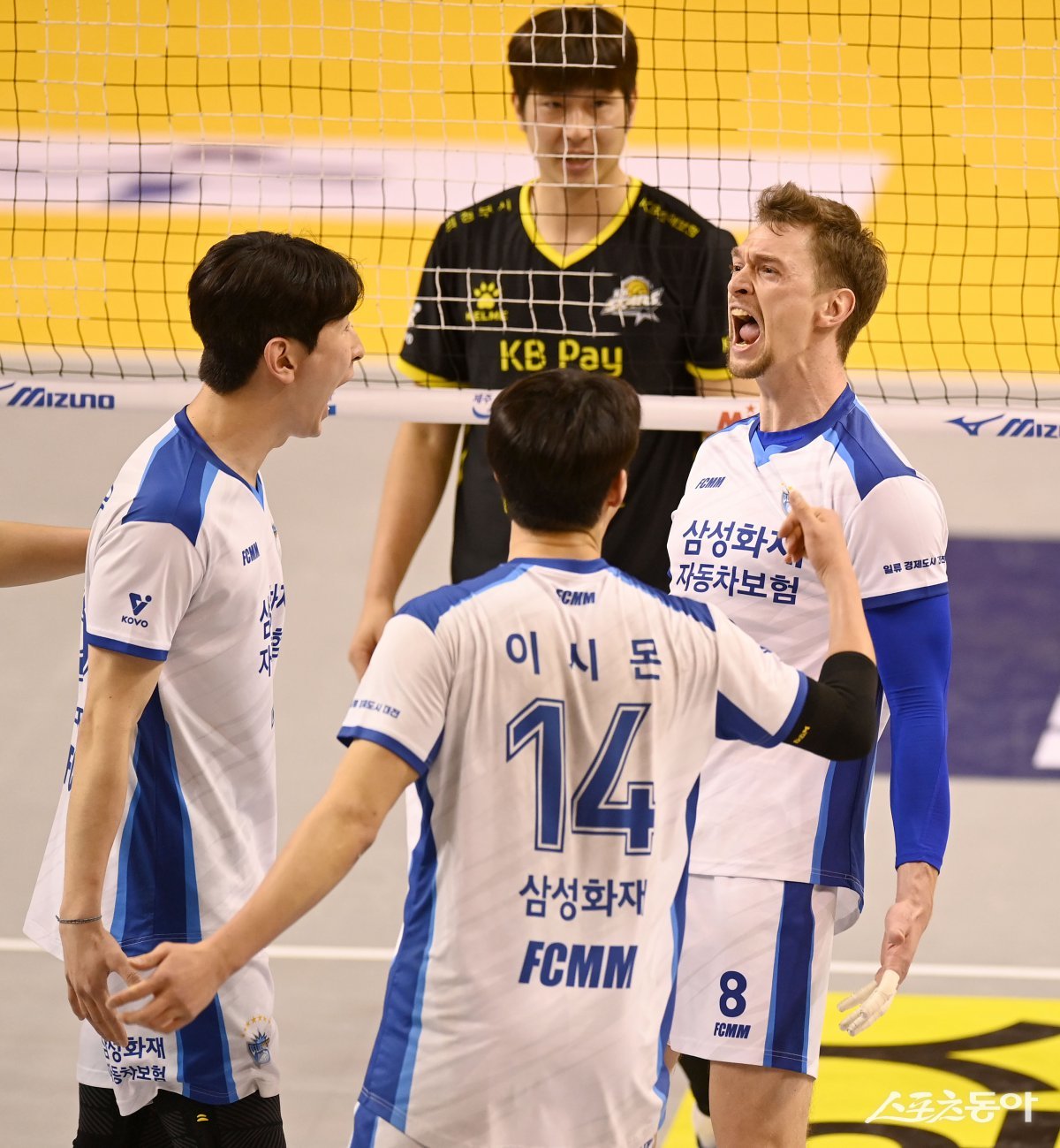 23일 의정부 경민대체육관에서 열린 ‘도드람 2024~2025 V-리그’ 남자부 KB손해보험과 삼성화재 경기에서 삼성화재 막심이 득점에 성공한 후 기뻐하고 있다. 의정부 | 김종원 기자 won@donga.com