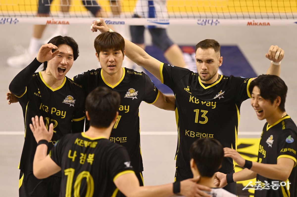 23일 의정부 경민대체육관에서 열린 ‘도드람 2024~2025 V-리그’ 남자부 KB손해보험과 삼성화재 경기에서 KB손해보험 황경민, 박상하, 비예나가 팀 득점에 기뻐하고 있다. 의정부 | 김종원 기자 won@donga.com