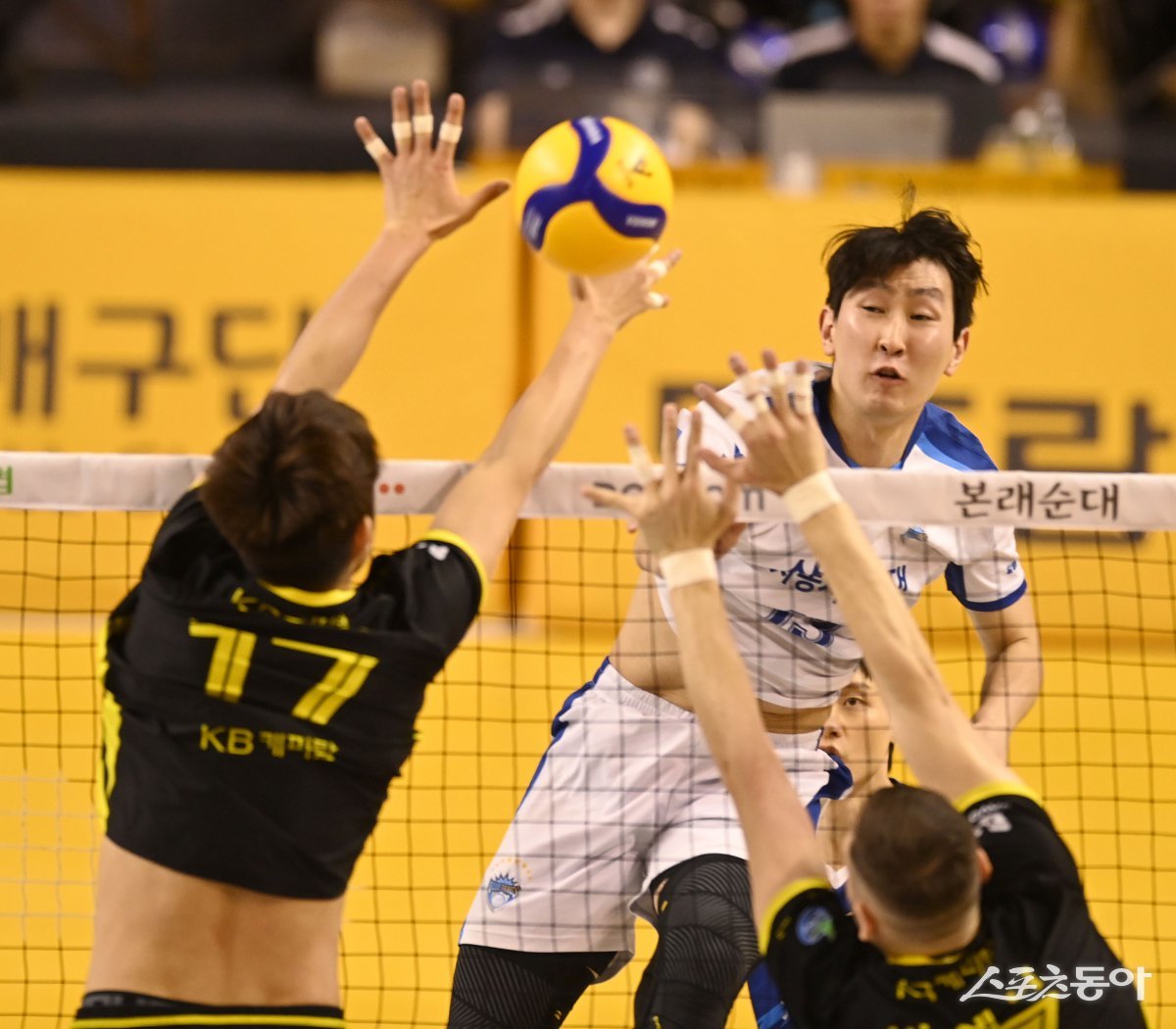 23일 의정부 경민대체육관에서 열린 ‘도드람 2024~2025 V-리그’ 남자부 KB손해보험과 삼성화재 경기에서 삼성화재 김준우가 KB손해보험의 블로킹 사이로 스파이크를 날리고 있다. 의정부 | 김종원 기자 won@donga.com