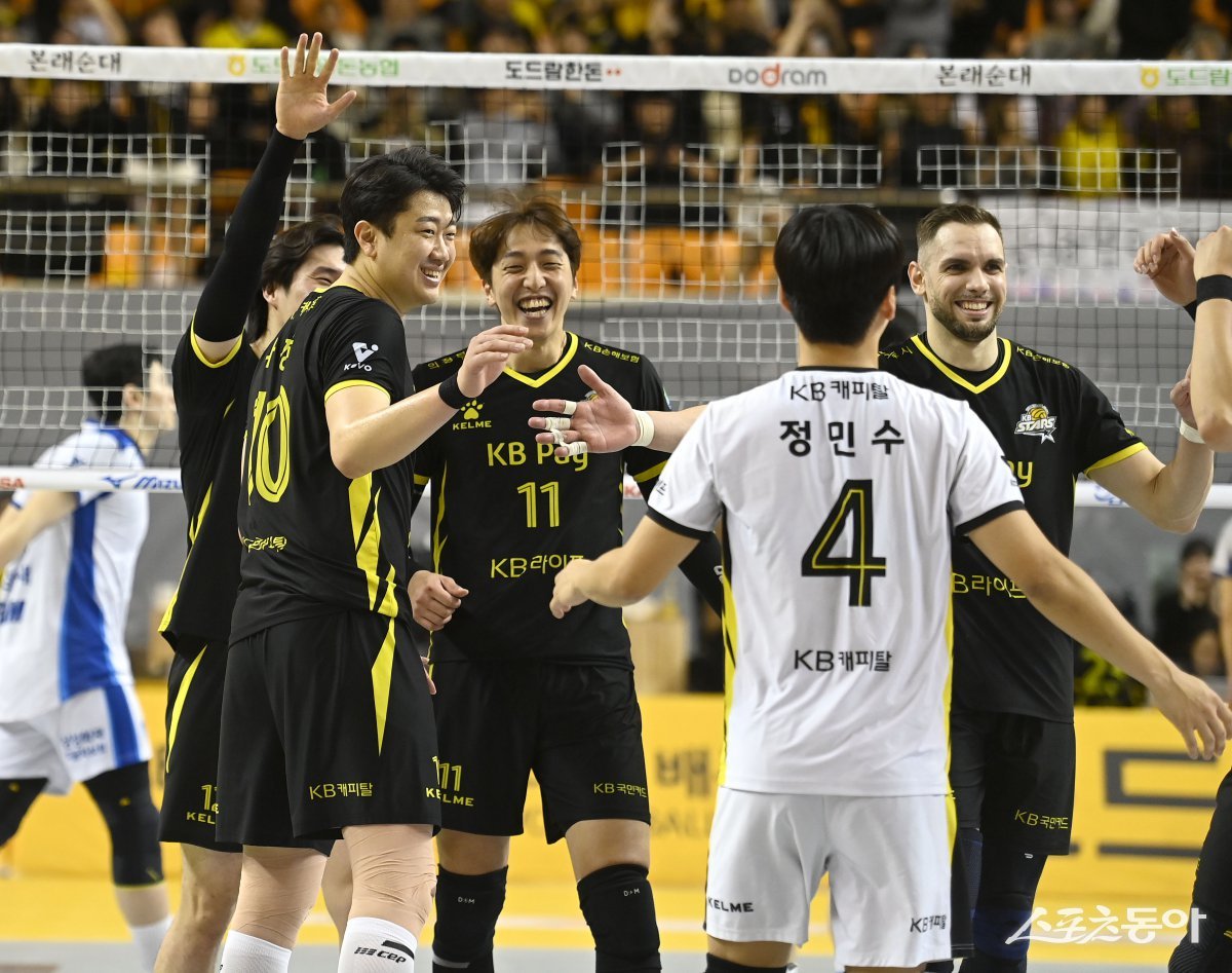 23일 의정부 경민대체육관에서 열린 ‘도드람 2024~2025 V-리그’ 남자부 KB손해보험과 삼성화재 경기에서 세트스코어 3-1 역전승을 거둔 KB손해보험 선수들이 기뻐하고 있다. 의정부 | 김종원 기자 won@donga.com