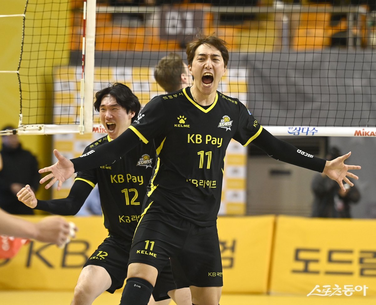 23일 의정부 경민대체육관에서 열린 ‘도드람 2024~2025 V-리그’ 남자부 KB손해보험과 삼성화재 경기에서 KB손해보험 차영석이 블로킹 득점에 성공한 후 황경민과 기뻐하고 있다. 의정부 | 김종원 기자 won@donga.com