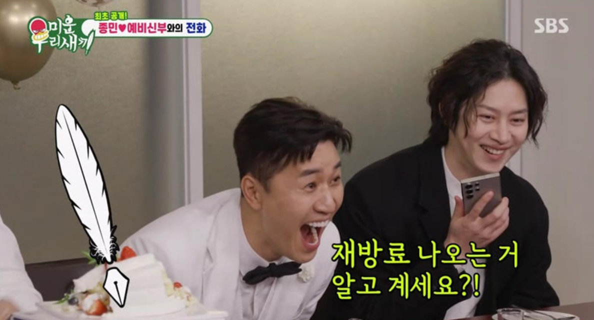 이날 김종민은 멤버들에게 11세 연하ㅇ 예비신부의 사진을 보여줬다. 멤버들은 배우 김지원, 가수 아이린 등을 닮았다며 미모에 감탄했다. 깜짝 전화 연결에서 김종민의 예비신부는 “오빠는 굉장히 듬직하고 배려심이 깊은 성격이다. 마음을 잘 헤아려 준다. 스윗한 사랑꾼”이라면서 “가끔 잘 삐치지만 그 모습도 귀엽다”고 애정을 표현했다.