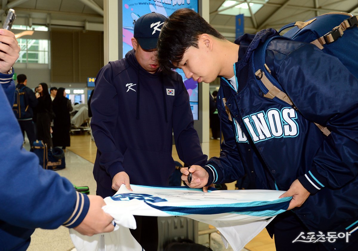 NC 다이노스가 30일 인천국제공항을 통해 2025시즌 스프링캠프가 열리는 미국으로 출국한다. 출국에 앞서 NC 임상현이 팬에게 사인을 하고 있다. 인천국제공항 | 김민성 기자 marineboy@donga.com