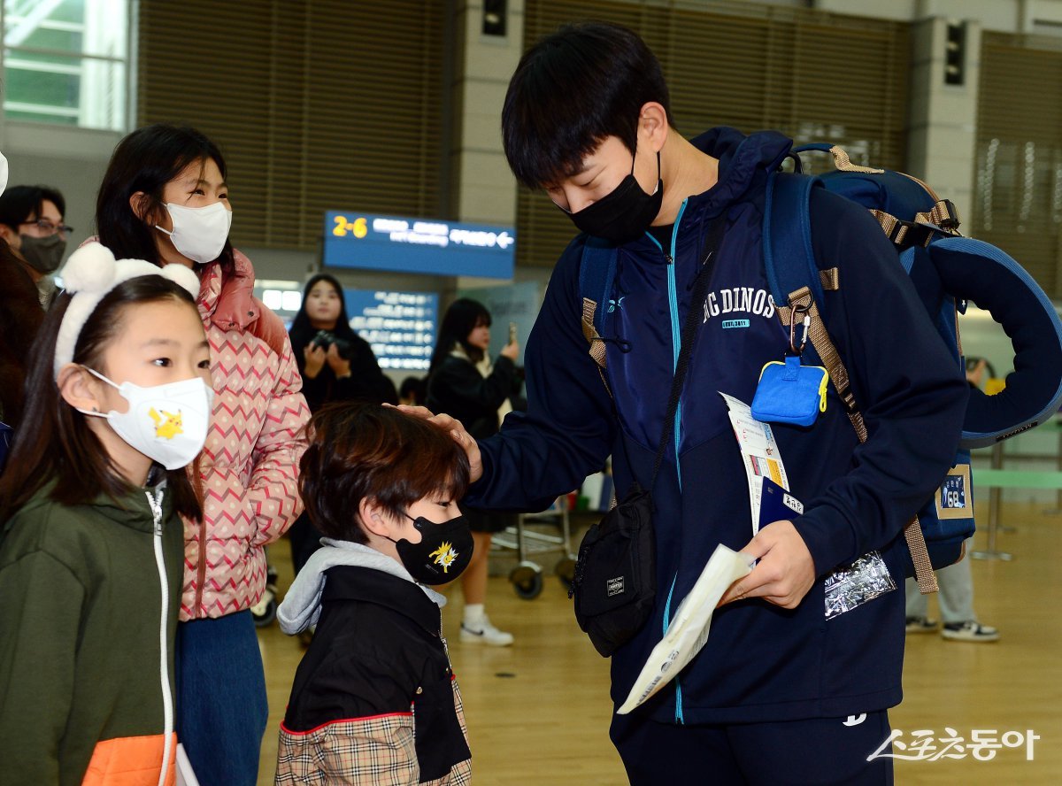NC 다이노스가 30일 인천국제공항을 통해 2025시즌 스프링캠프가 열리는 미국으로 출국한다. 출국에 앞서 NC 김한별이 어린이팬에게 선물을 받고 있다. 인천국제공항 | 김민성 기자 marineboy@donga.com