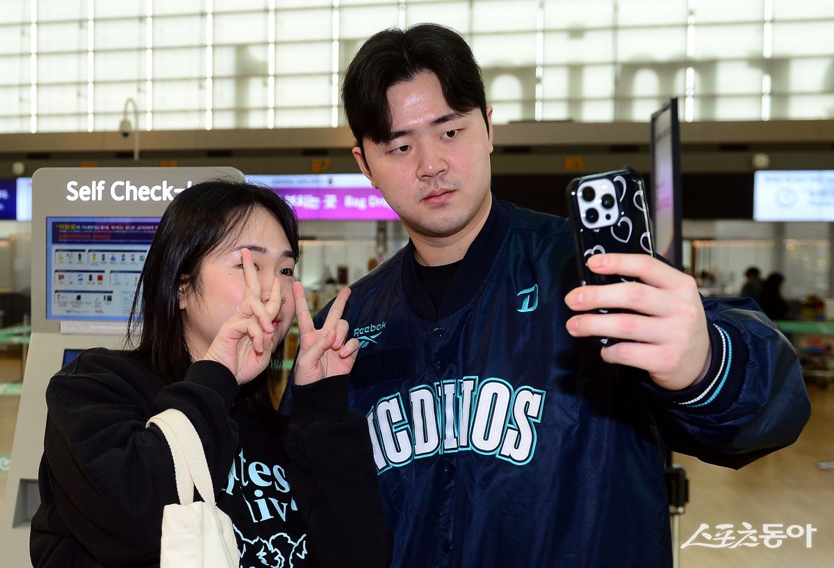 NC 다이노스가 30일 인천국제공항을 통해 2025시즌 스프링캠프가 열리는 미국으로 출국한다. 출국에 앞서 NC 김형준이 팬과 기념촬영을 하고 있다. 인천국제공항 | 김민성 기자 marineboy@donga.com