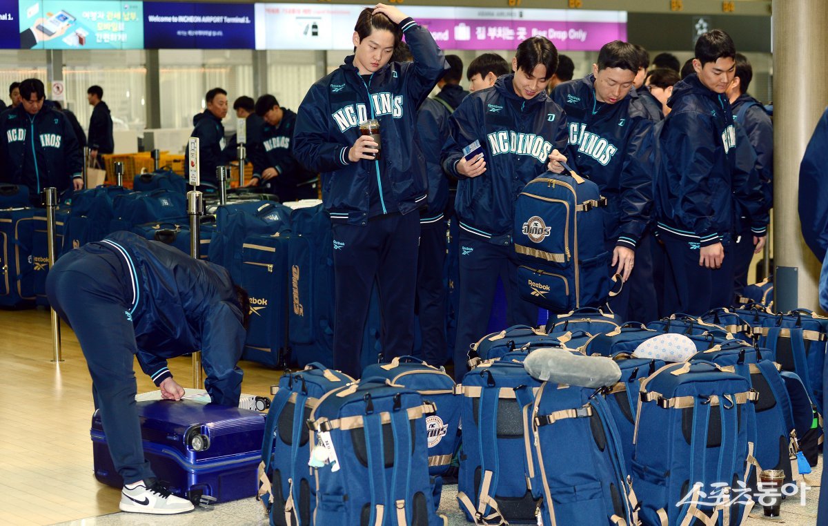 NC 다이노스가 30일 인천국제공항을 통해 2025시즌 스프링캠프가 열리는 미국으로 출국한다. 출국에 앞서 NC 선수들이 짐을 정리하고 있다. 인천국제공항 | 김민성 기자 marineboy@donga.com