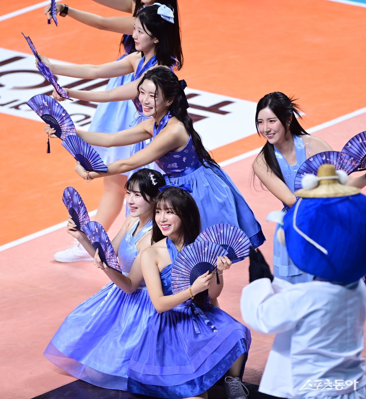 30일 서울 장충체육관에서 열린 ‘도드람 2024-2025 V리그’ 남자부 우리카드와 OK저축은행의 경기에서 우리카드 치어리더들이 한복을 입고 공연을 펼치고 있다. 장충 | 주현희 기자 teth1147@donga.com