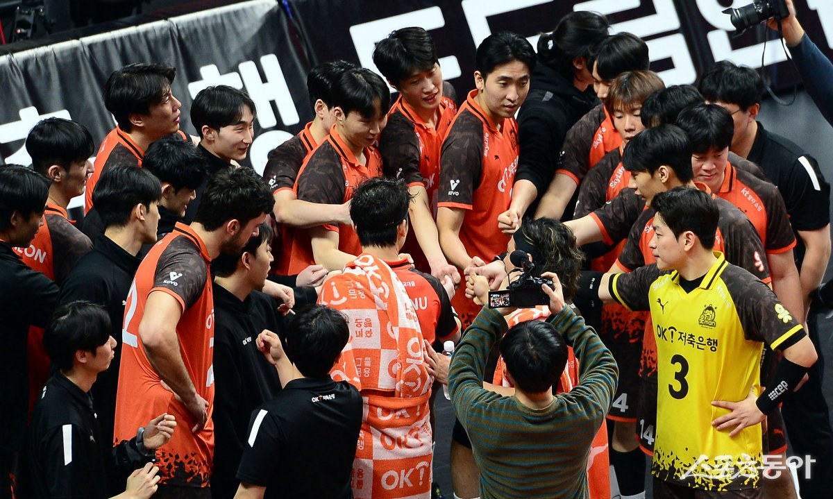 2일 경기도 안산 상록수체육관에서 ‘도드람 2024-2025 V리그’ OK저축은행과 우리은행의 남자부 경기가 열렸다. OK저축은행이 우리카드를 상대로 세트스코어 3-1로 승리한 후 선수들이 코트에서 기쁨을 나누고 있다. 안산 | 김민성 기자 marineboy@donga.com