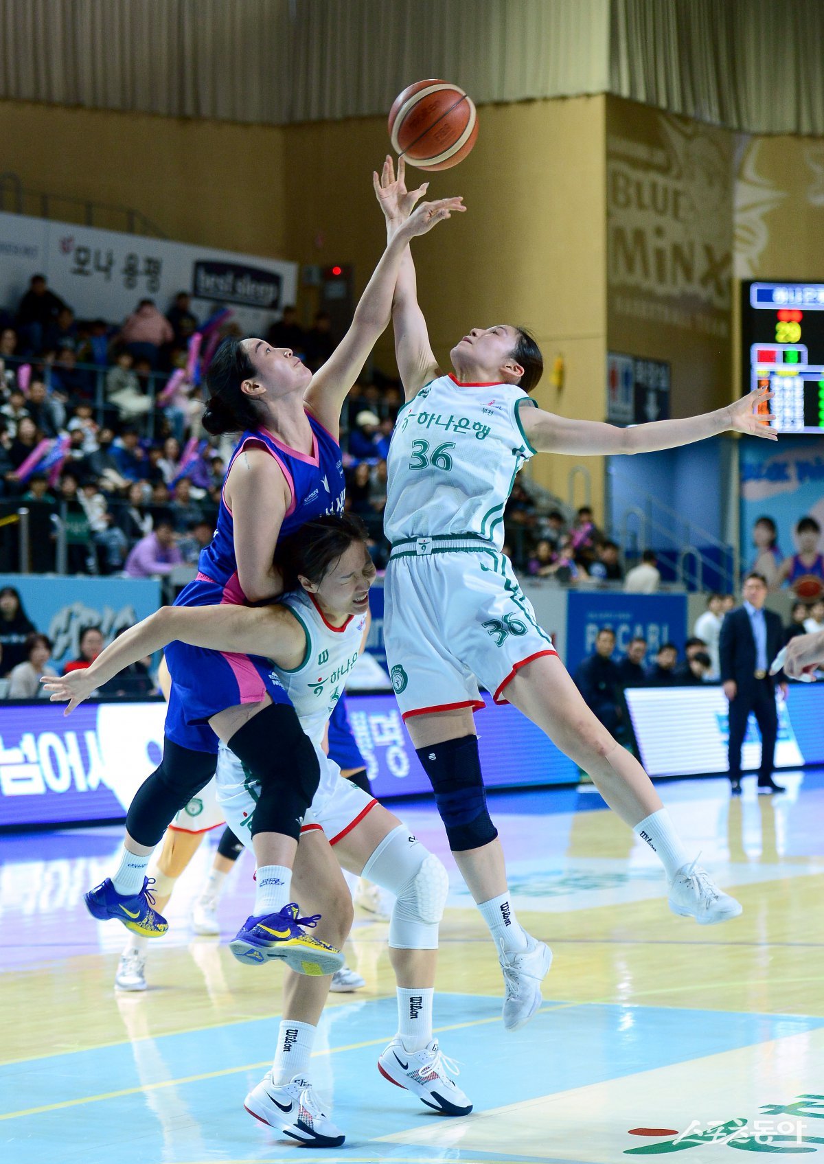2일 용인체육관에서 열린 ‘하나은행 2024~25 여자프로농구’ 삼성생명과 하나은행 경기에서 삼성생명 김아름과 하나은행 유즈키가 리바운드 볼을 다투고 있다. 용인 | 김종원 기자 won@donga.com