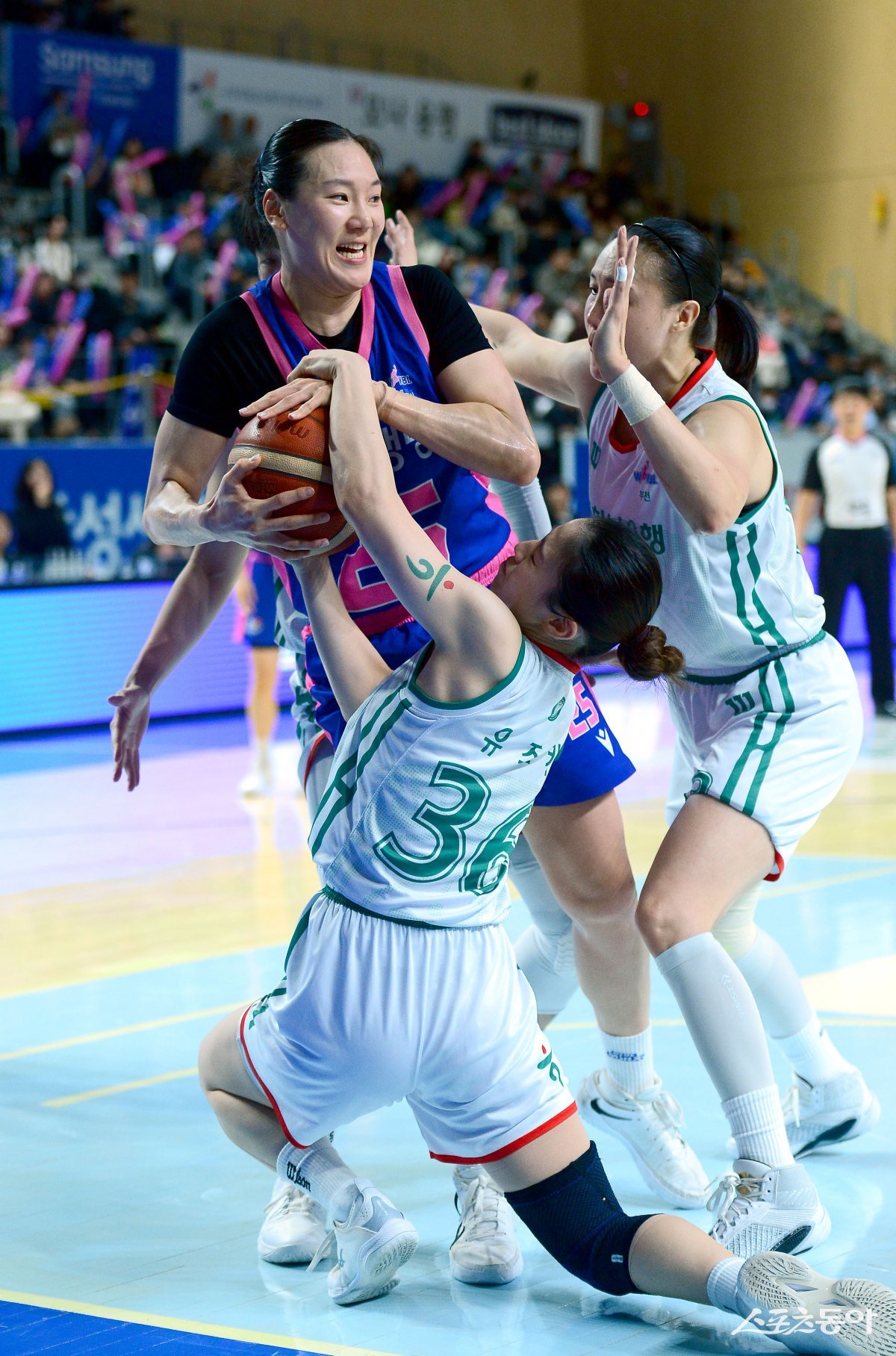 2일 용인체육관에서 열린 ‘하나은행 2024~25 여자프로농구’ 삼성생명과 하나은행 경기에서 삼성생명 배혜윤과 하나은행 유즈키가 루즈볼을 다투고 있다. 용인 | 김종원 기자 won@donga.com