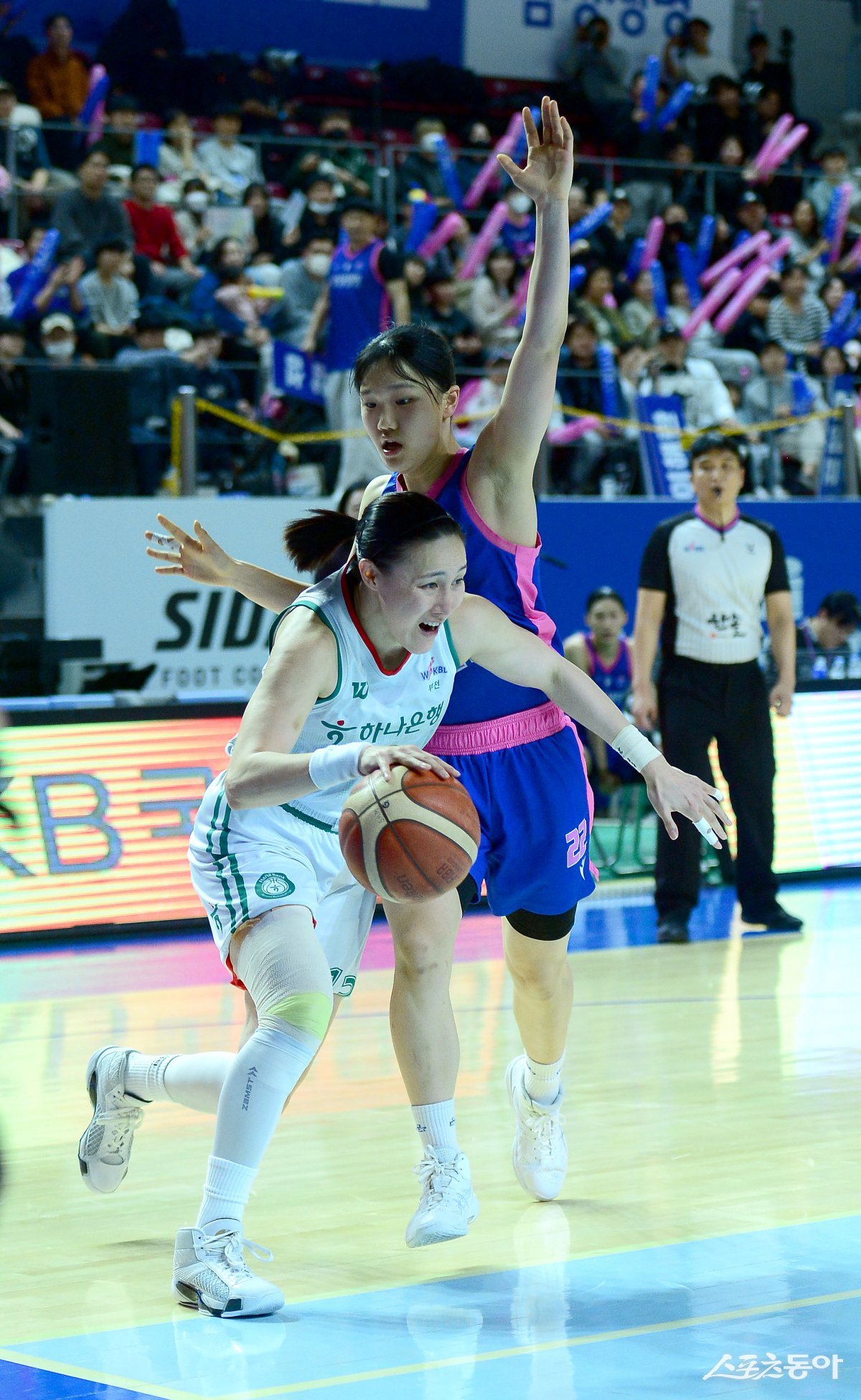 2일 용인체육관에서 열린 ‘하나은행 2024~25 여자프로농구’ 삼성생명과 하나은행 경기에서 하나은행 김정은이 삼성생명의 수비를 뚫고 골밑을 공격하고 있다. 용인 | 김종원 기자 won@donga.com
