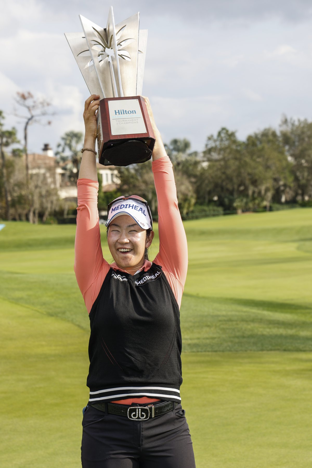 김아림이 3일(한국시간) LPGA 시즌 개막전 힐튼 그랜드 배케이션스 토너먼트에서 우승을 차지한 뒤 챔피언 트로피를 번쩍 치켜들고 포효하고 있다. 올랜도(미 플로리다주) | AP뉴시스
