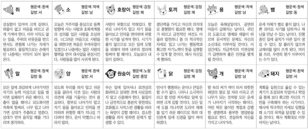 돼지띠 : 계획을실천으로옮길수있는계기가조성되며직업이나학업을통해보다확고한자신의기반을구축해야하는시기이다.매사에적극적인자세로임했을때소기의목적을달성할수있을것이다.매사계획대로이루어지는날이다.