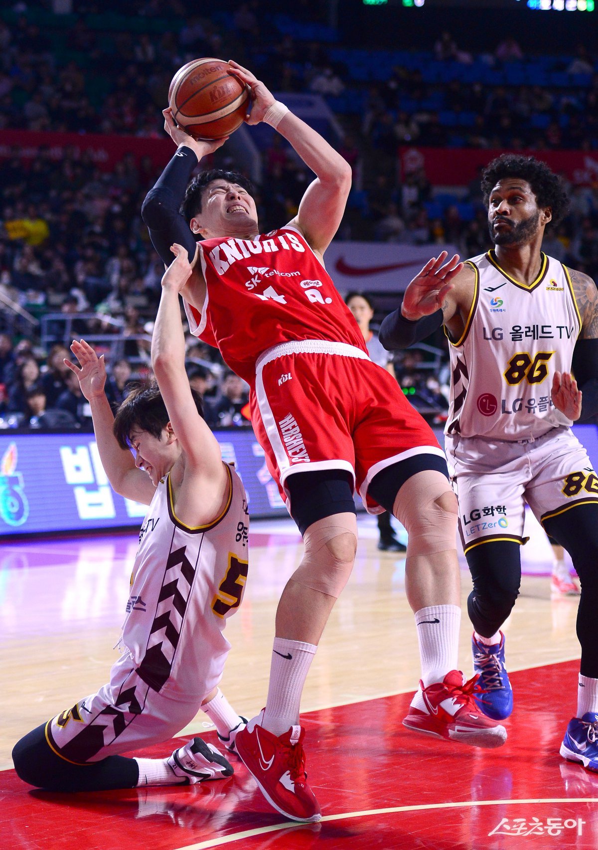 3일 서울 잠실학생체육관에서 열린 ‘2024-2025 프로농구’ 1위 SK와 공동 2위 LG 경기에서 SK 최부경이 넘어지며 슛을 던지고 있다. 잠실|김종원 기자 won@donga.com