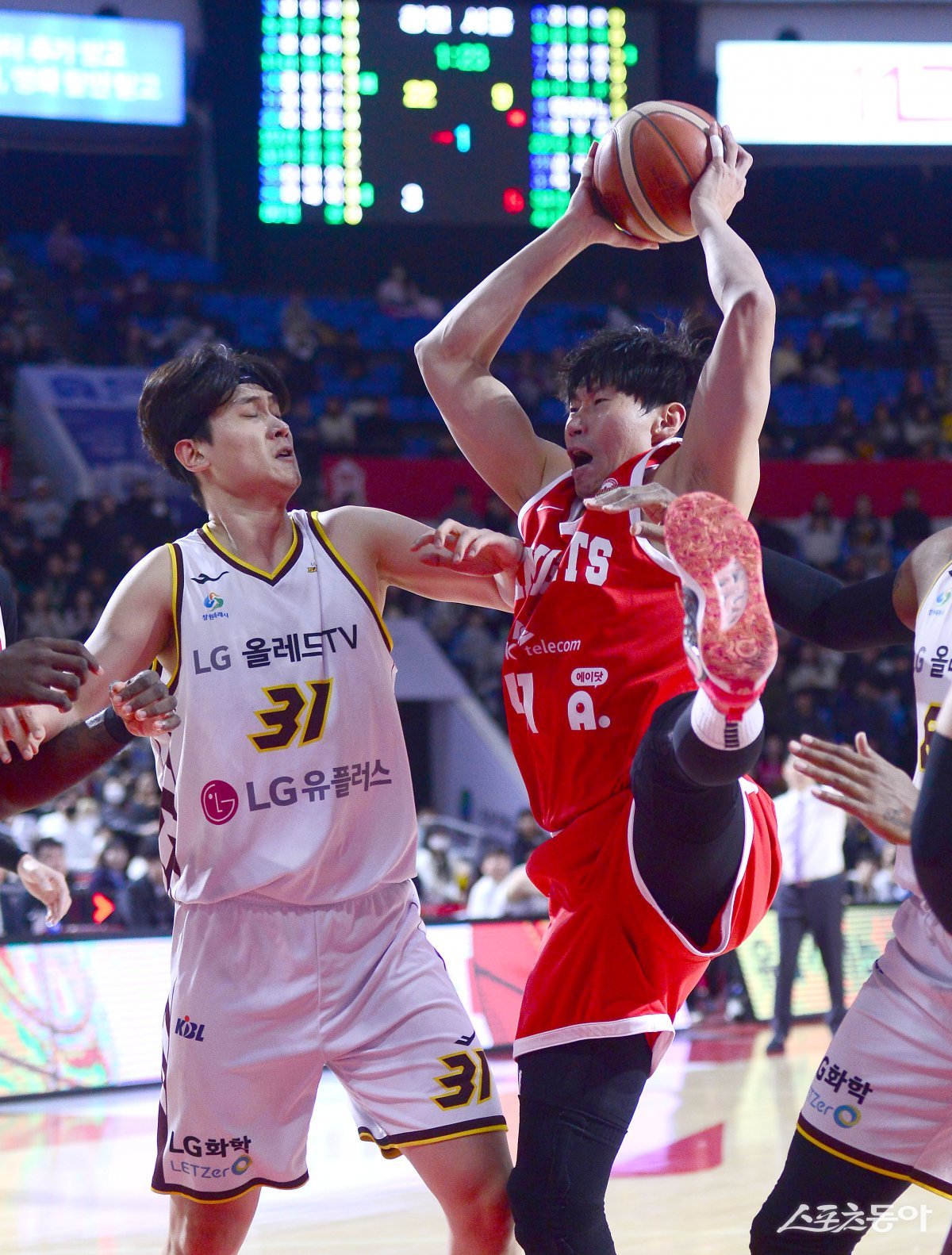 3일 서울 잠실학생체육관에서 열린 ‘2024-2025 프로농구’ 1위 SK와 공동 2위 LG 경기에서 SK 오세근이 리바운드 볼을 잡고 있다. 잠실|김종원 기자 won@donga.com