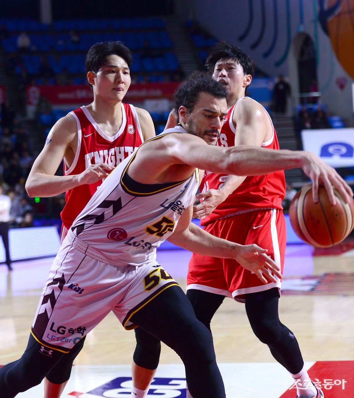 3일 서울 잠실학생체육관에서 열린 ‘2024-2025 프로농구’ 1위 SK와 공동 2위 LG 경기에서 LG 마레이가 리바운드 볼을 잡고 있다. 잠실|김종원 기자 won@donga.com