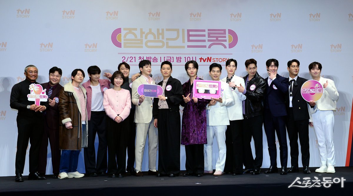 4일 서울 라마다서울신도림호텔에서 tvN STORY ‘잘생긴 트롯’ 제작발표회가 열렸다. 추성훈(왼쪽부터), 태항호, 장혁, 현우, 황다원 PD 최대철, 김동호, 인교진, 이태리, 지승현, 김준호, 정겨운, 한정완이 카메라를 향해 포즈를 취하고 있다. 김민성 기자 marineboy@donga.com
