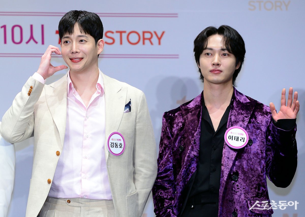 4일 서울 라마다서울신도림호텔에서 tvN STORY ‘잘생긴 트롯’ 제작발표회가 열렸다. 김동호와 이태리가 카메라를 향해 포즈를 취하고 있다. 김민성 기자 marineboy@donga.com