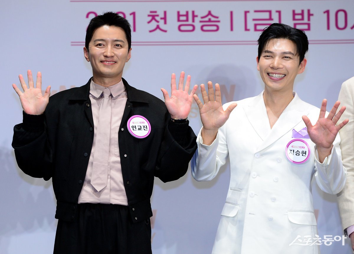 4일 서울 라마다서울신도림호텔에서 tvN STORY ‘잘생긴 트롯’ 제작발표회가 열렸다. 인교진과 지승현이 카메라를 향해 포즈를 취하고 있다. 김민성 기자 marineboy@donga.com