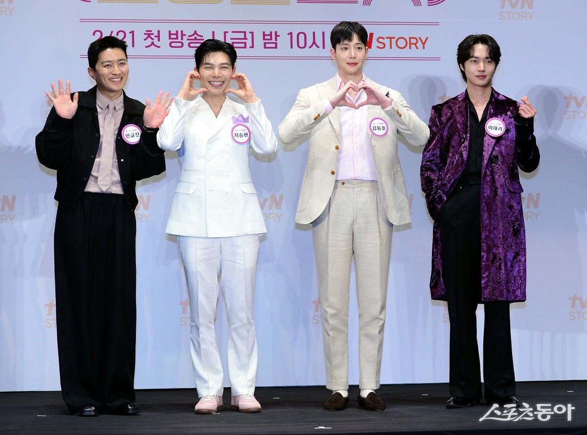 4일 서울 라마다서울신도림호텔에서 tvN STORY ‘잘생긴 트롯’ 제작발표회가 열렸다. 인교진, 지승현, 김동호, 이태리가 카메라를 향해 포즈를 취하고 있다. 김민성 기자 marineboy@donga.com