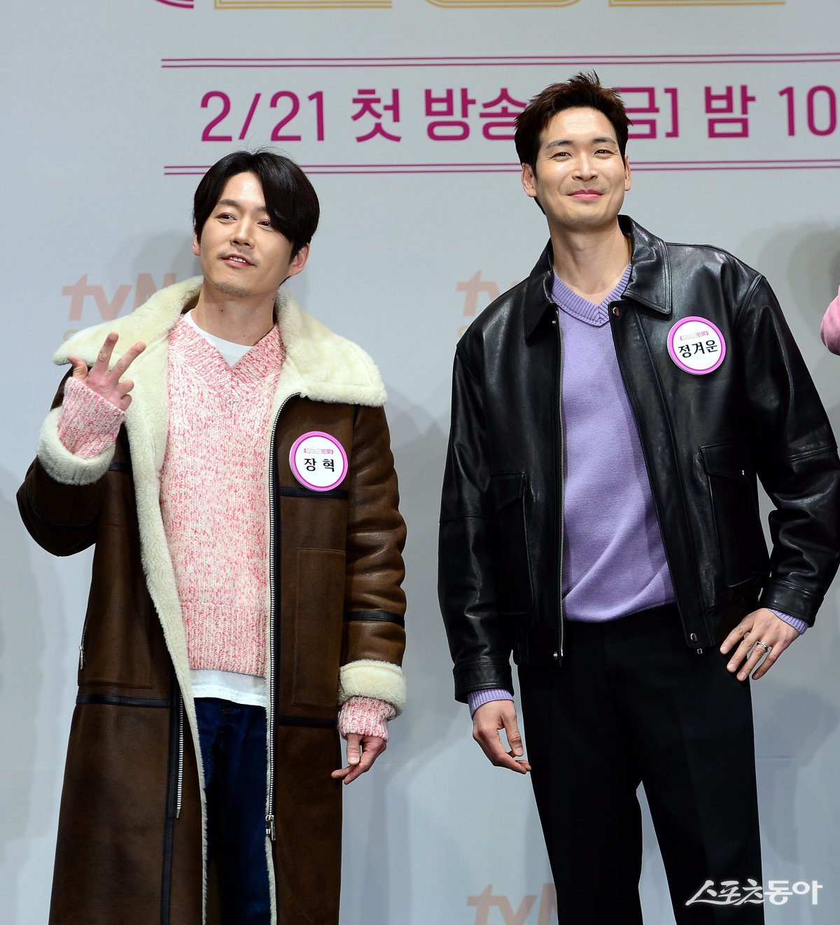 4일 서울 라마다서울신도림호텔에서 tvN STORY ‘잘생긴 트롯’ 제작발표회가 열렸다. 장혁과 정겨운이 카메라를 향해 포즈를 취하고 있다. 김민성 기자 marineboy@donga.com
