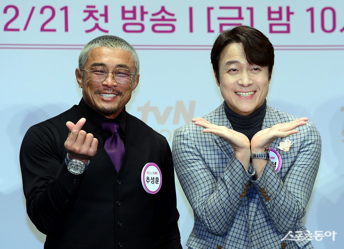 4일 서울 라마다서울신도림호텔에서 tvN STORY ‘잘생긴 트롯’ 제작발표회가 열렸다. 추성훈과 최대철이 카메라를 향해 포즈를 취하고 있다. 김민성 기자 marineboy@donga.com