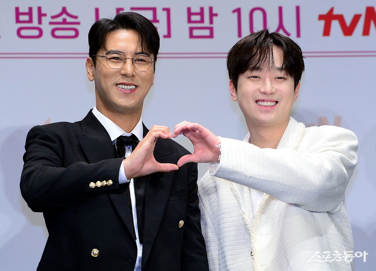 4일 서울 라마다서울신도림호텔에서 tvN STORY ‘잘생긴 트롯’ 제작발표회가 열렸다. MC를 맡은 가수 장민호와 이찬원이 카메라를 향해 포즈를 취하고 있다. 김민성 기자 marineboy@donga.com