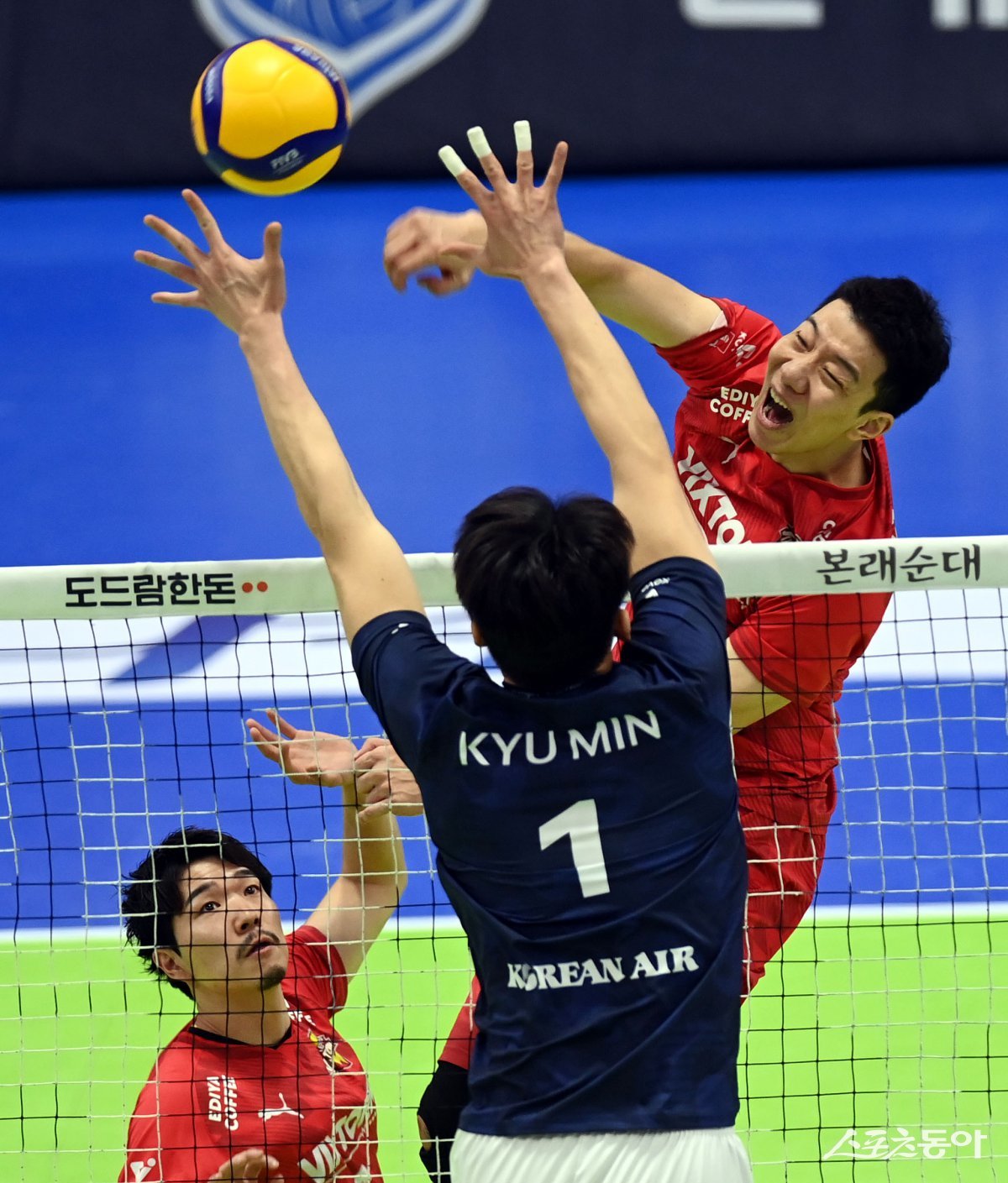 4일 경기도 수원체육관에서 ‘도드람 2024-2025 V리그’ 한국전력과 대한항공의 남자부 경기가 열렸다. 한국전력 신영석이 대한항공 블로커를 피해 공격을 펼치고 있다. 수원 | 김민성 기자 marineboy@donga.com