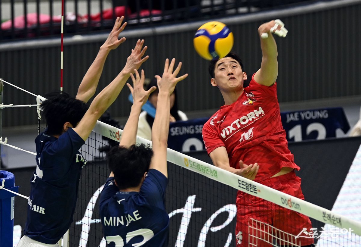 4일 경기도 수원체육관에서 ‘도드람 2024-2025 V리그’ 한국전력과 대한항공의 남자부 경기가 열렸다. 한국전력 김동영이 대한항공 블로커를 피해 스파이크를 날리고 있다. 수원 | 김민성 기자 marineboy@donga.com
