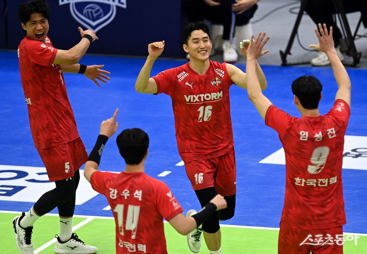 4일 경기도 수원체육관에서 ‘도드람 2024-2025 V리그’ 한국전력과 대한항공의 남자부 경기가 열렸다. 한국전력 김동영이 득점 후 동료와 기쁨을 나누고 있다. 수원 | 김민성 기자 marineboy@donga.com