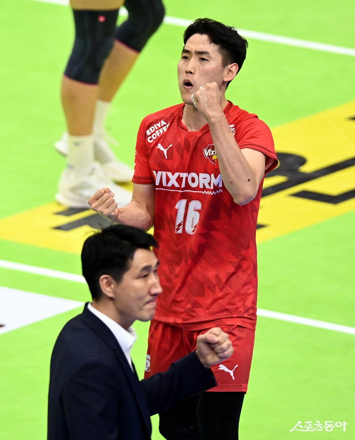 4일 경기도 수원체육관에서 ‘도드람 2024-2025 V리그’ 한국전력과 대한항공의 남자부 경기가 열렸다. 한국전력 김동영이 득점 후 기뻐하고 있다. 수원 | 김민성 기자 marineboy@donga.com