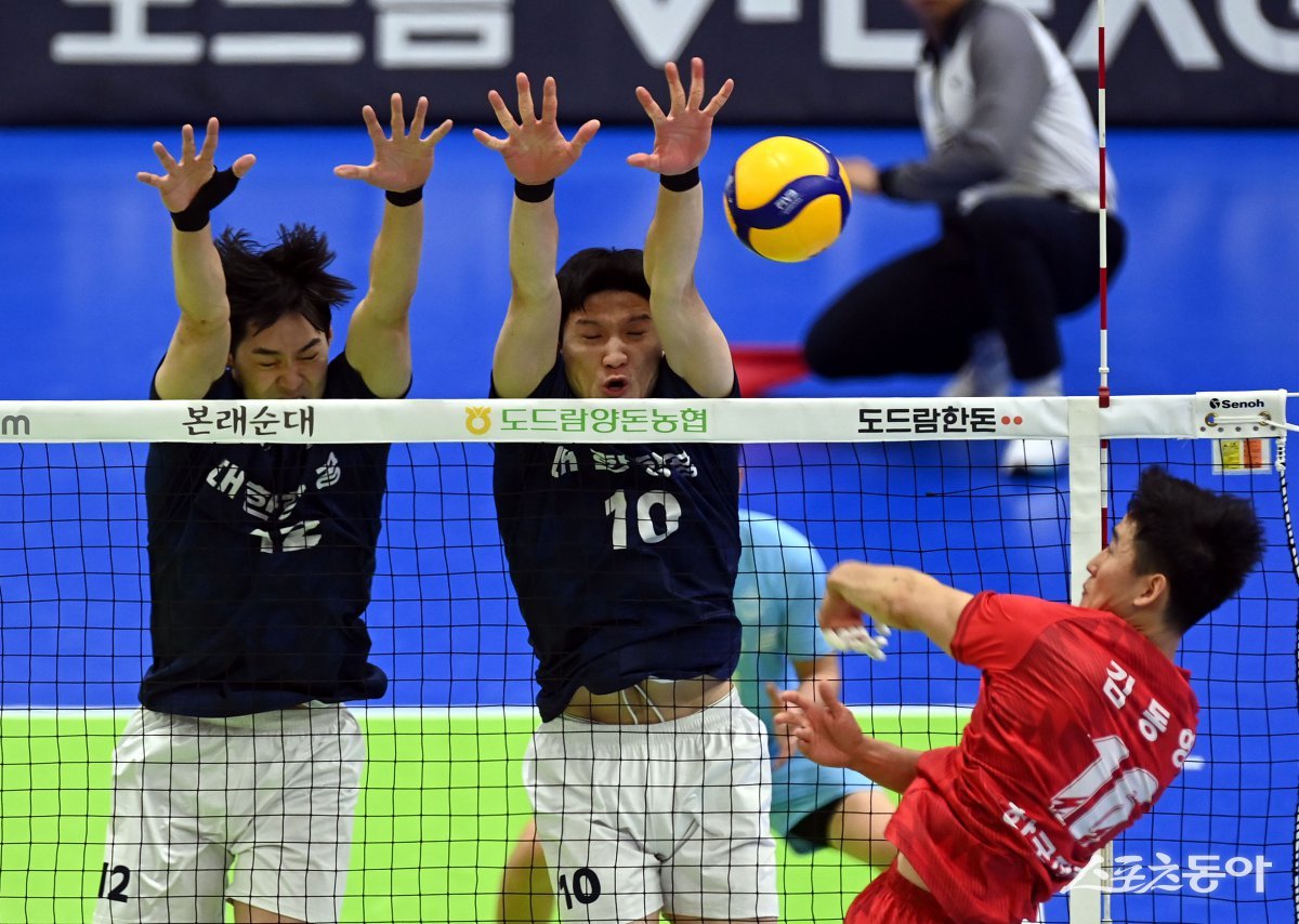 4일 경기도 수원체육관에서 ‘도드람 2024-2025 V리그’ 한국전력과 대한항공의 남자부 경기가 열렸다. 대한항공 정지석이 한국전력의 공격을 블로킹하고 있다. 수원 | 김민성 기자 marineboy@donga.com