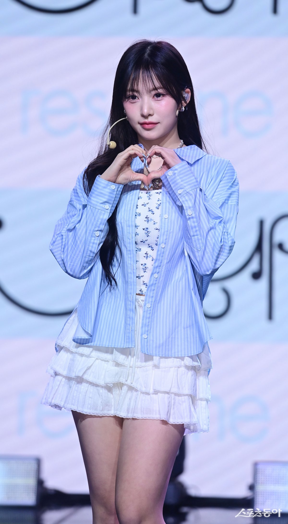 그룹 리센느 리브가 5일 서울 강남구 청담동 일지아트홀에서 열린 미니앨범 2집 ‘Glow Up‘ 발매 기념 쇼케이스에서 포즈를 취하고 있다. 주현희 기자 teth1147@donga.com