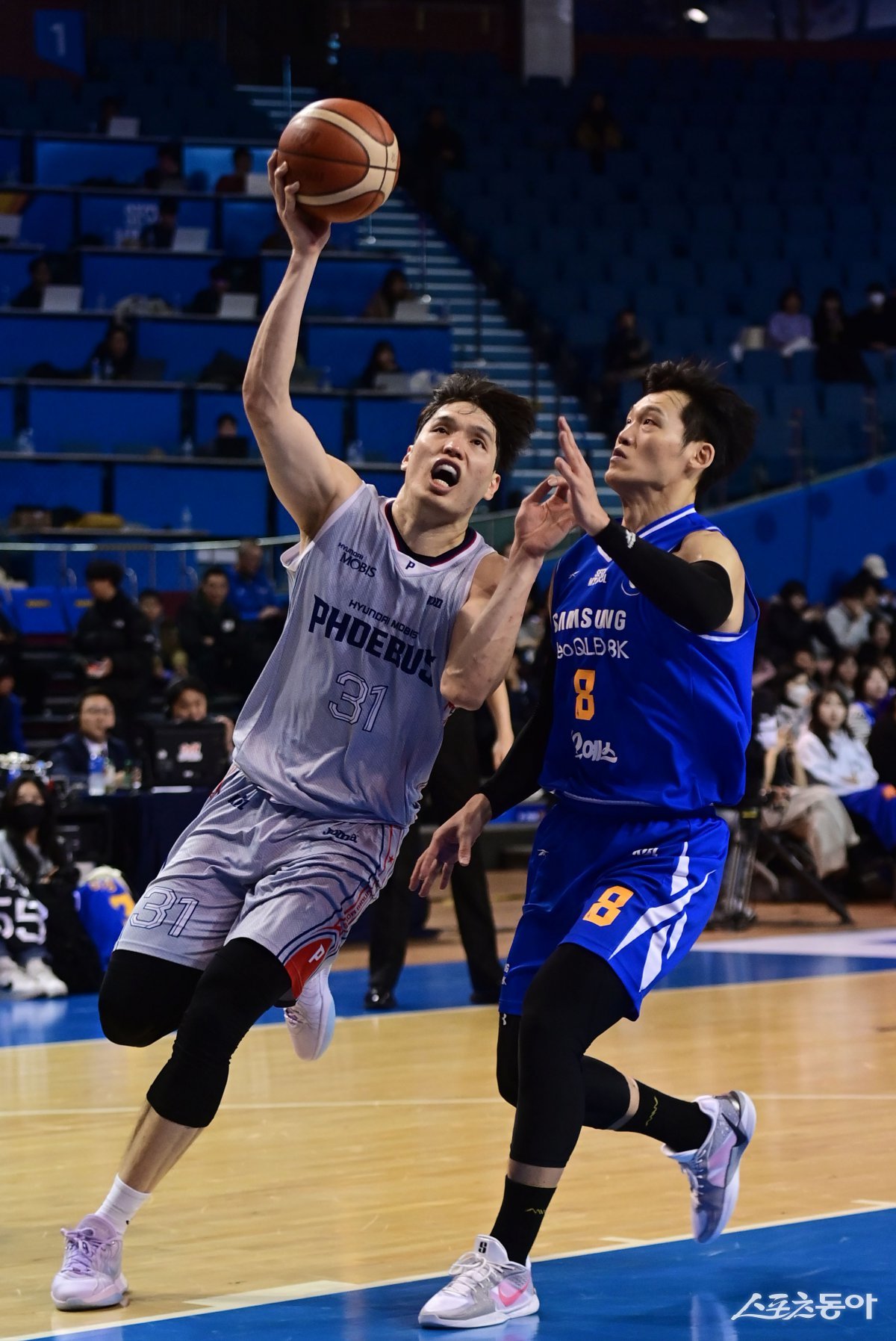 5일 서울 잠실실내체육관에서 열린 ‘2024-2025 KCC 프로농구’ 삼성과 현대모비스의 경기에서 현대모비스 장재석이 삼성 최현민의 수비를 뚫고 슛을 하고 있다. 잠실 | 주현희 기자 teth1147@donga.com