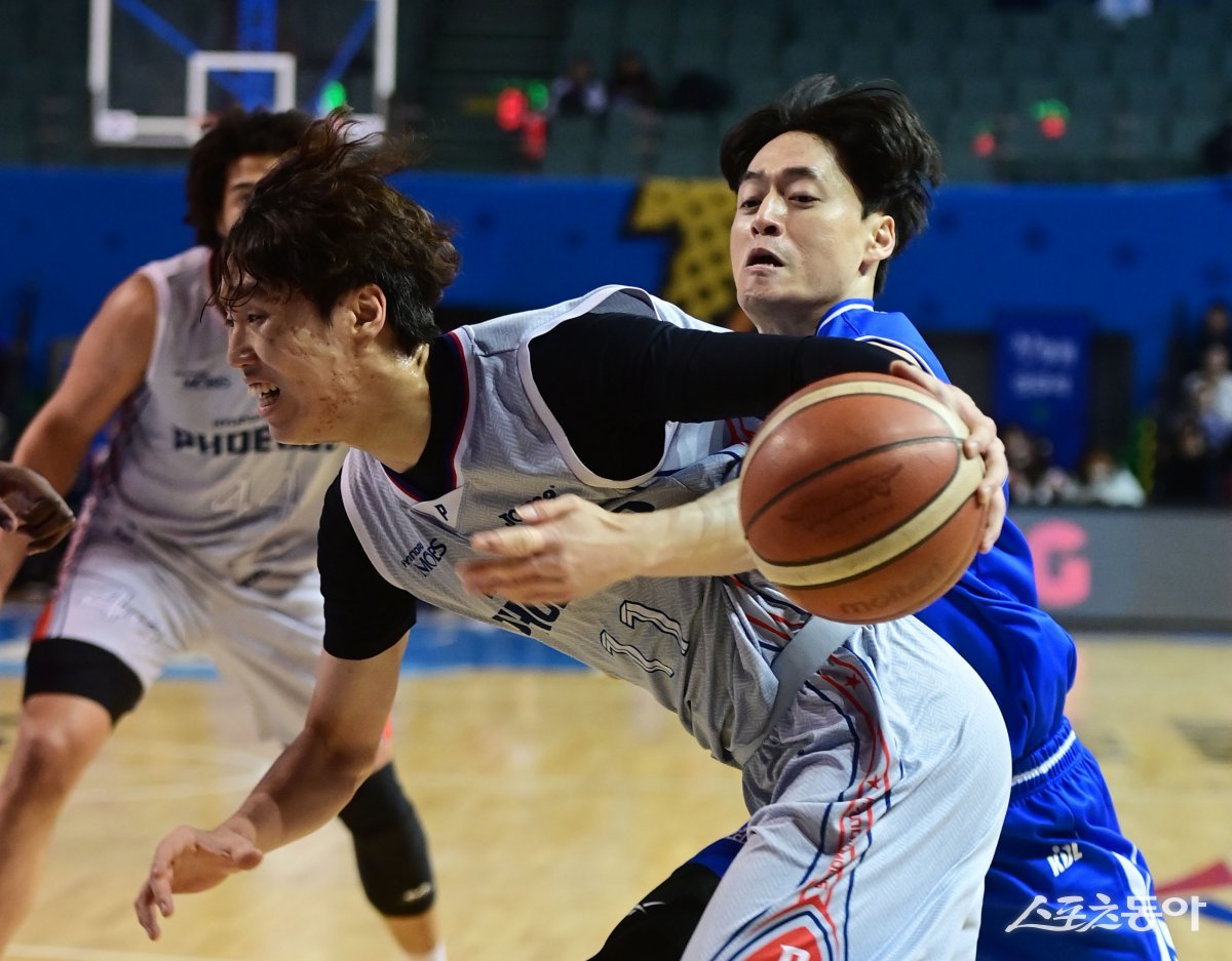 5일 서울 잠실실내체육관에서 열린 ‘2024-2025 KCC 프로농구’ 삼성과 현대모비스의 경기에서 현대모비스 이우석이 삼성 최승욱의 수비를 뚫고 드리블 돌파를 하고 있다. 잠실 | 주현희 기자 teth1147@donga.com