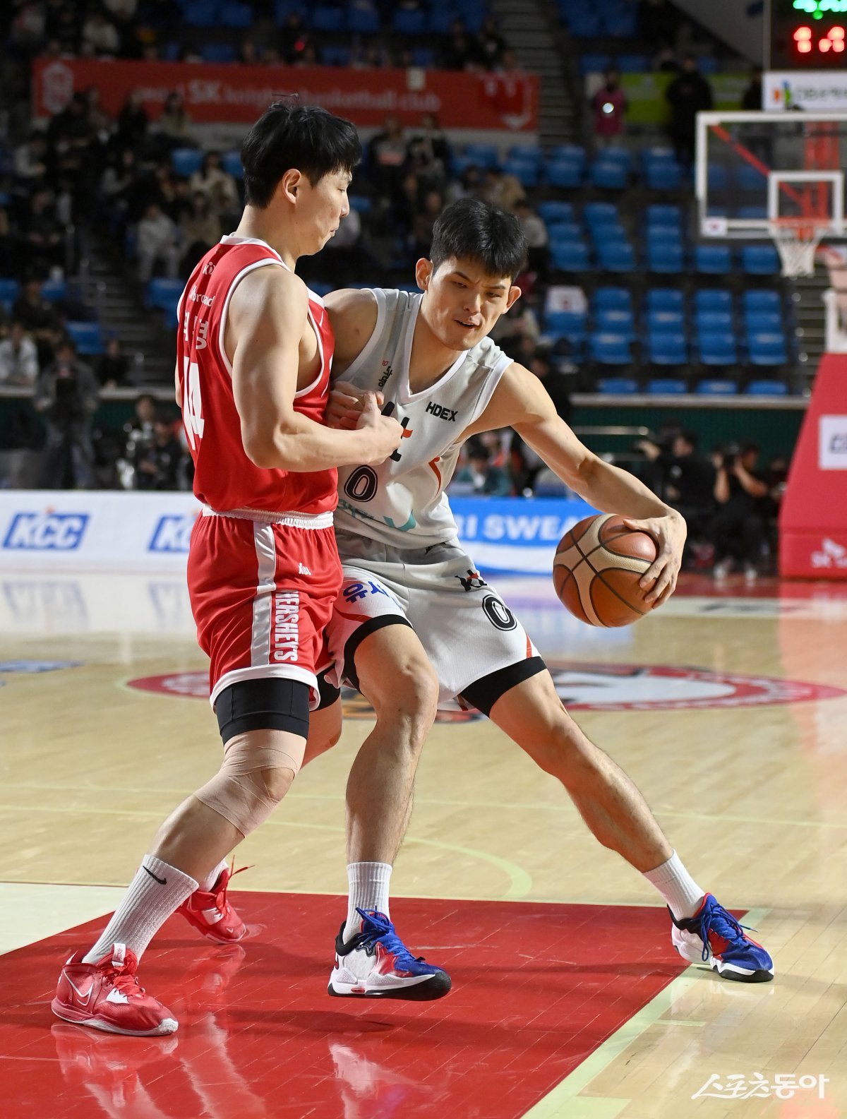 6일 서울 잠실학생체육관에서 열린 ‘2024-2025 프로농구’ SK와 KT 경기에서 KT 하윤기가 SK의 수비를 뚫고 골밑을 공격하고 있다. 잠실|김종원 기자 won@donga.com
