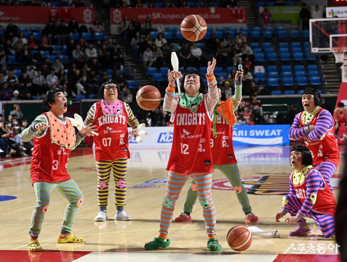 6일 서울 잠실학생체육관에서 열린 ‘2024-2025 프로농구’ SK와 KT 경기에서 코미디 그룹 옹알스가 시투를 하고 있다. 잠실|김종원 기자 won@donga.com