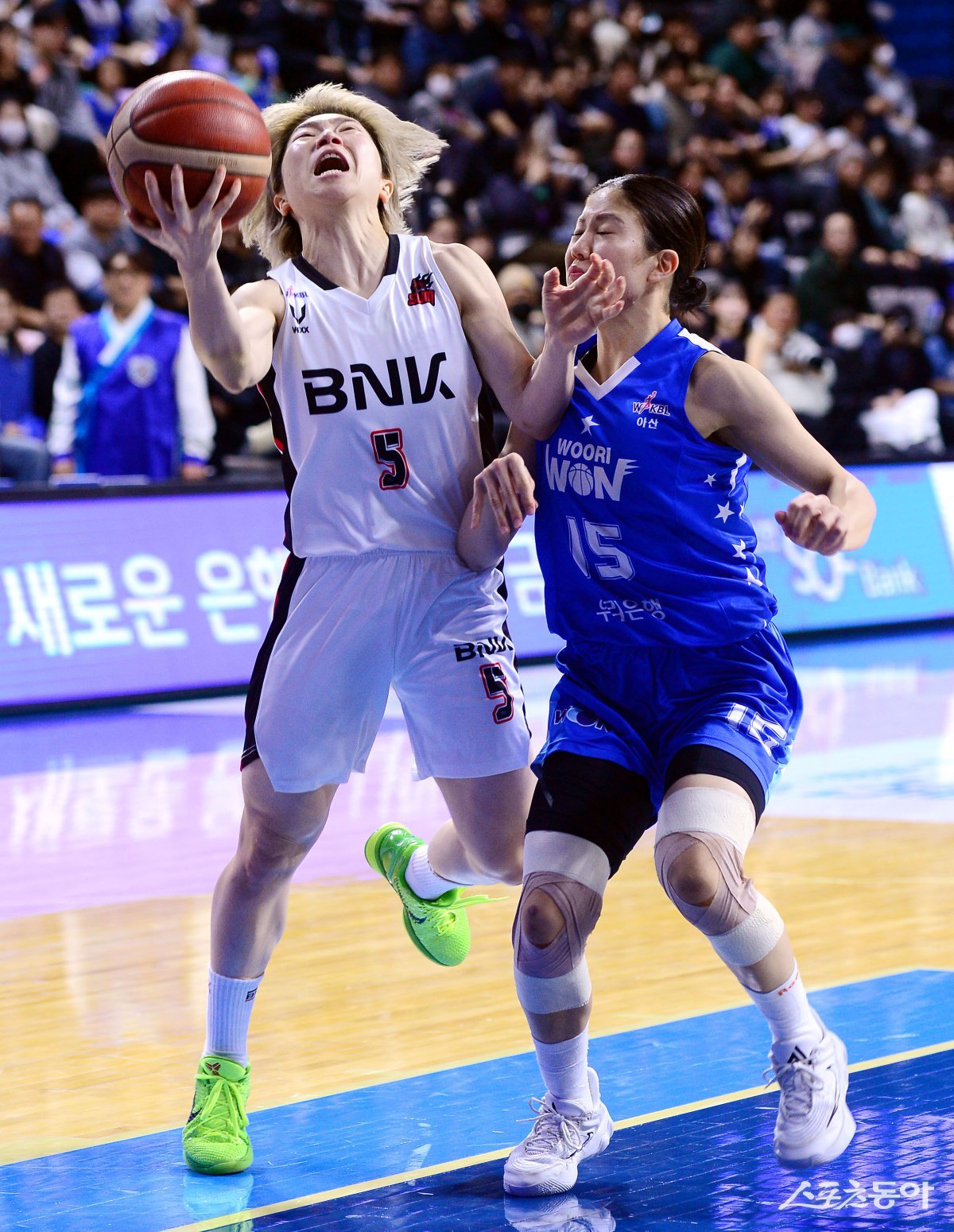 6일 충남 아산 이순신체육관에서 열린 ‘하나은행 2024-2025 여자프로농구’ 우리은행과 BNK썸의 경기에서 BNK썸 안혜지가 우리은행 나츠키의 수비를 피해 슛을 쏘고 있다. 아산 | 김민성 기자 marineboy@donga.com