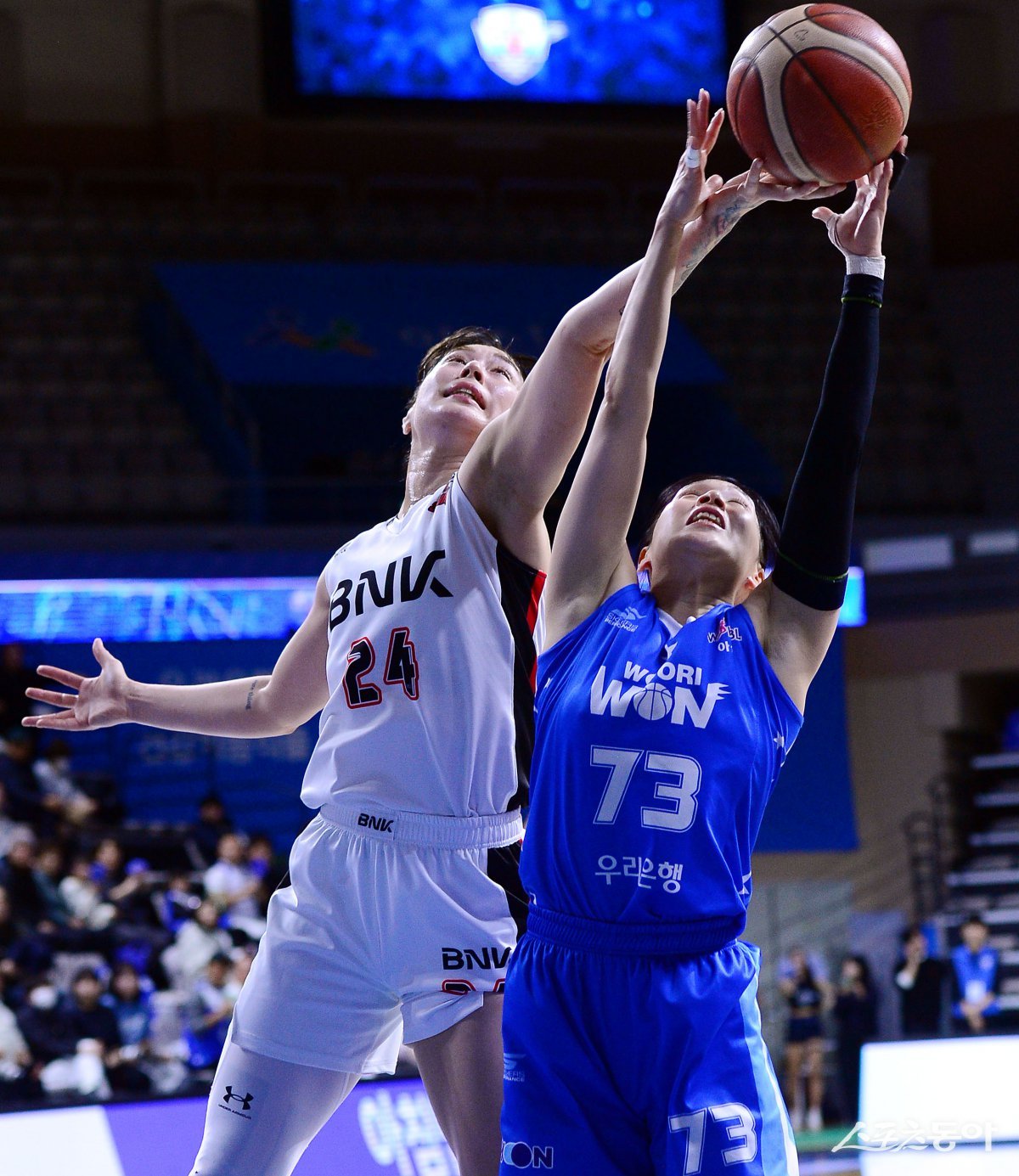 6일 충남 아산 이순신체육관에서 열린 ‘하나은행 2024-2025 여자프로농구’ 우리은행과 BNK썸의 경기에서 BNK썸 김소니아가 우리은행 모모나가 리바운드를 다투고 있다. 아산 | 김민성 기자 marineboy@donga.com