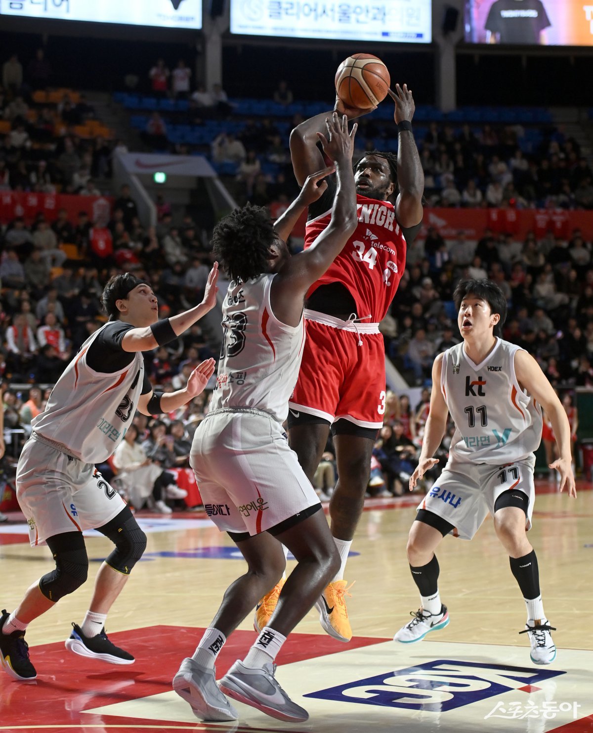 6일 서울 잠실학생체육관에서 열린 ‘2024-2025 프로농구’ SK와 KT 경기에서 SK 워니가 KT의 수비를 뚫고 골밑 슛을 하고 있다. 잠실|김종원 기자 won@donga.com