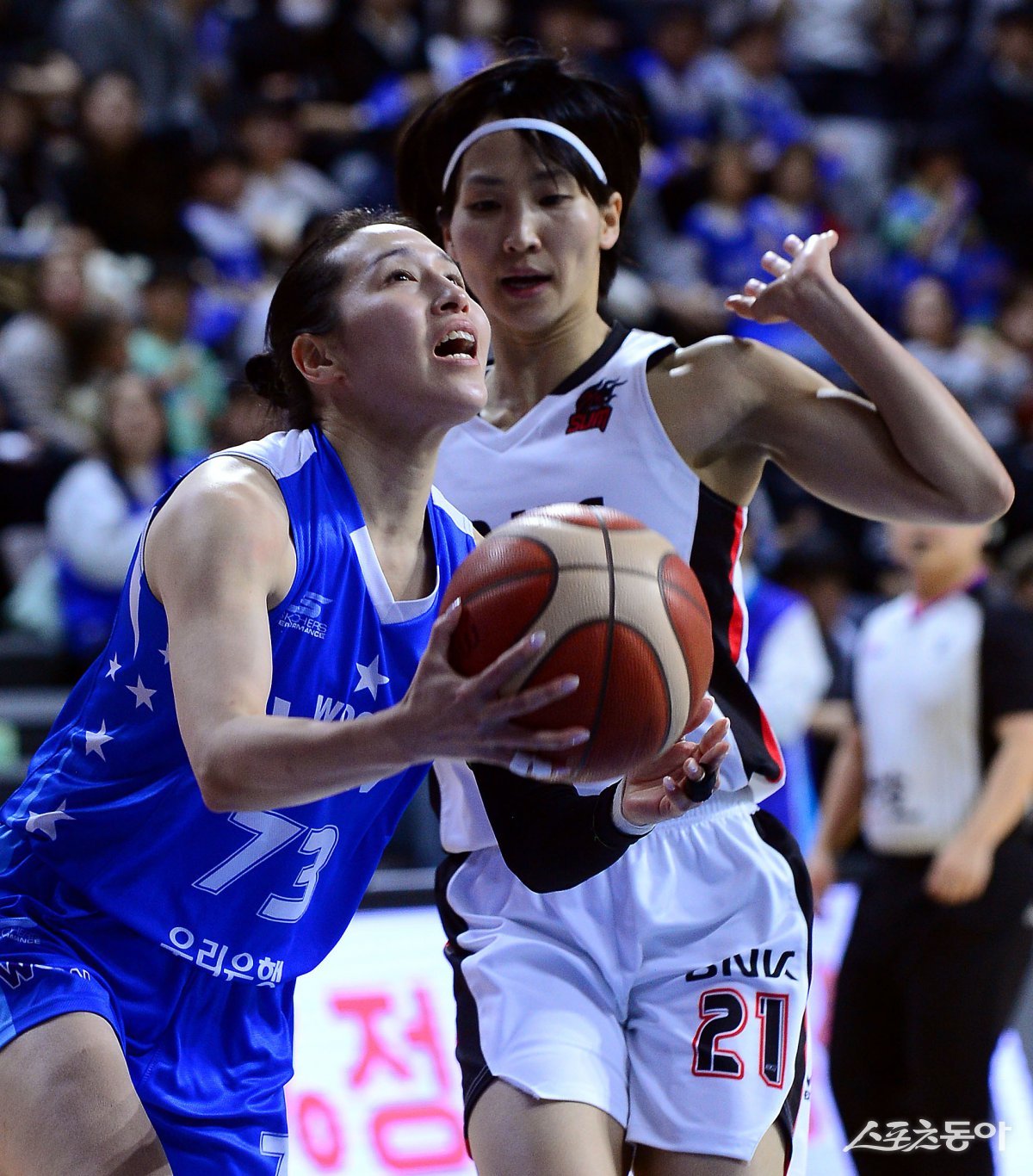 6일 충남 아산 이순신체육관에서 열린 ‘하나은행 2024-2025 여자프로농구’ 우리은행과 BNK썸의 경기에서 우리은행 모모나가 BNK썸 사키의 수비를 피해 슛을 시도하고 있다. 아산 | 김민성 기자 marineboy@donga.com