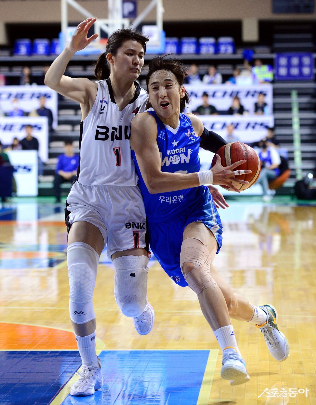 6일 충남 아산 이순신체육관에서 열린 ‘하나은행 2024-2025 여자프로농구’ 우리은행과 BNK썸의 경기에서 우리은행 김단비가 BNK썸 변소정의 수비를 피해 돌파하고 있다. 아산 | 김민성 기자 marineboy@donga.com