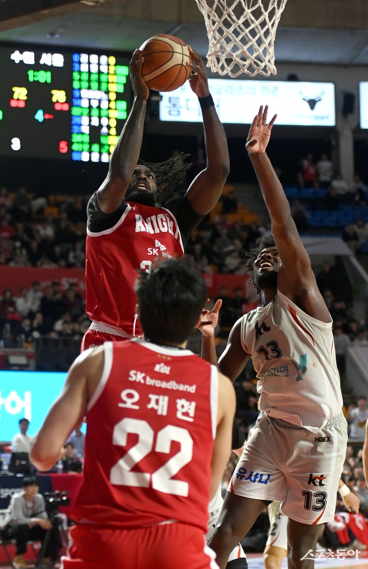 6일 서울 잠실학생체육관에서 열린 ‘2024-2025 프로농구’ SK와 KT 경기에서 SK 워니가 KT의 수비를 뚫고 탭 슛을 하고 있다. 잠실|김종원 기자 won@donga.com