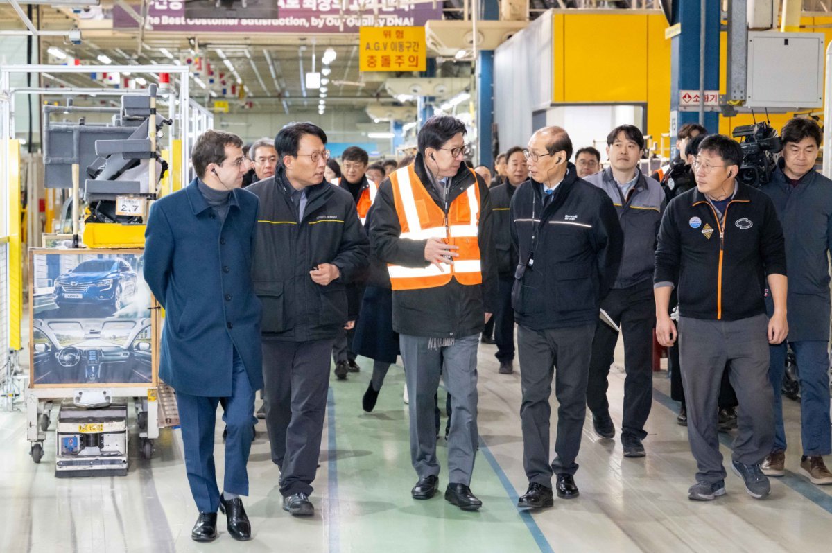 스테판 드블레즈 사장(왼쪽 첫번째), 박형준 시장(왼쪽 세번째), 이해진 제조본부장(왼쪽 네번째)이 부산공장을 점검하고 있다. 사진제공 |르노코리아자동차