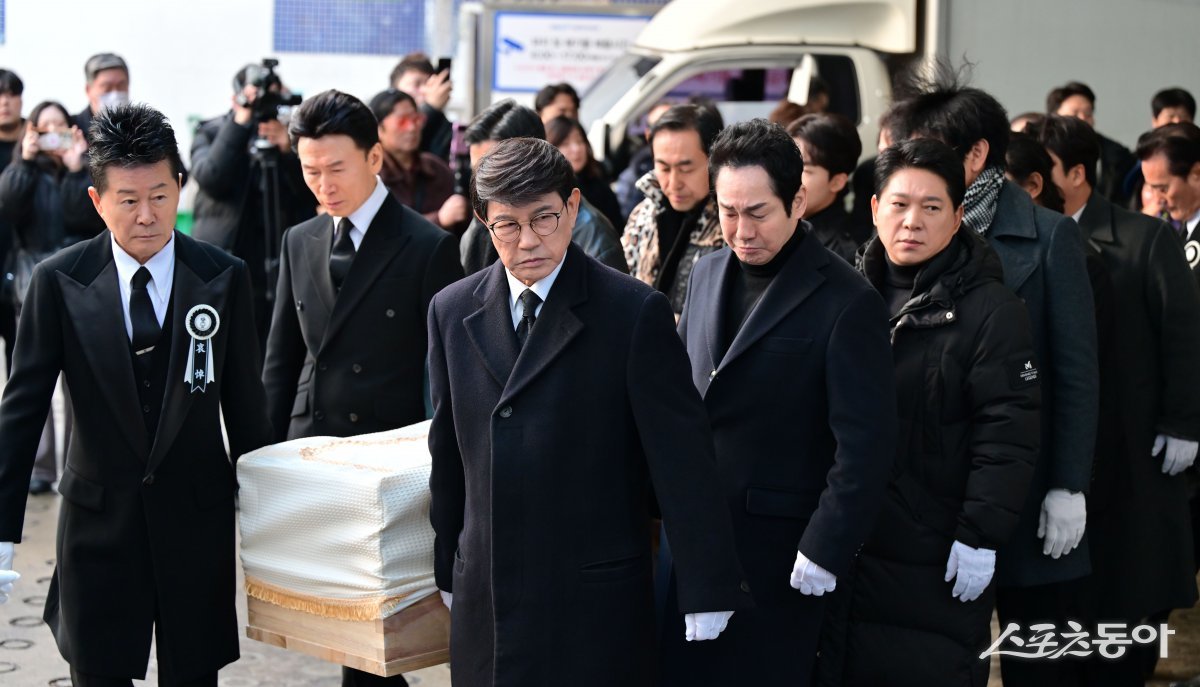 고 송대관의 발인이 9일 서울 종로구 서울대학교병원 장례식장에서 엄수됐다. 가수 태진아, 설운도, 박상철 등 가수들이 운구를 하고 있다. 주현희 기자 teth1147@donga.com